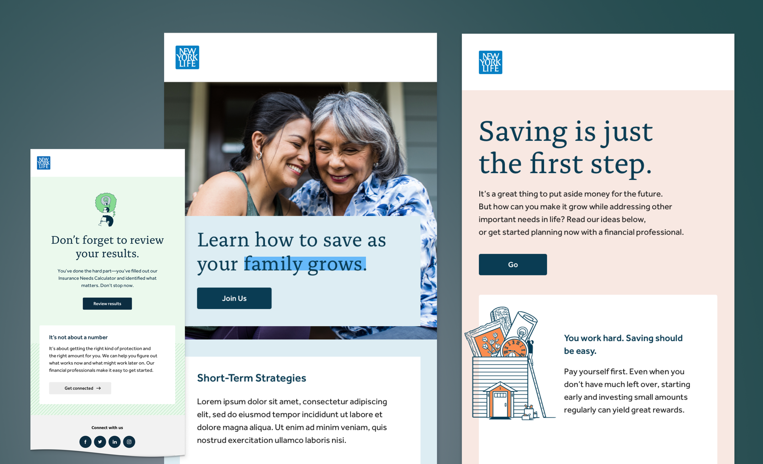 As Creative Director on the New York Life account I led the development of a modular email design system. Coupled with CRM data and content aligned to customer journeys, the system lays the foundation for truly personalized email marketing. The flexible system supports quick production of on-brand email communications across campaigns and products.